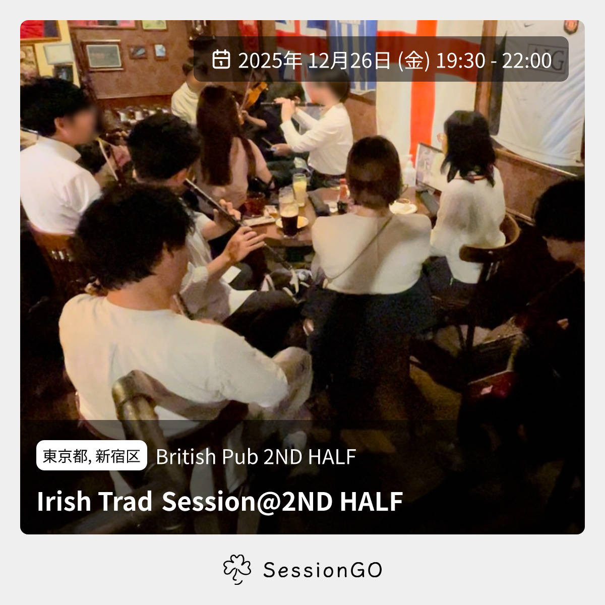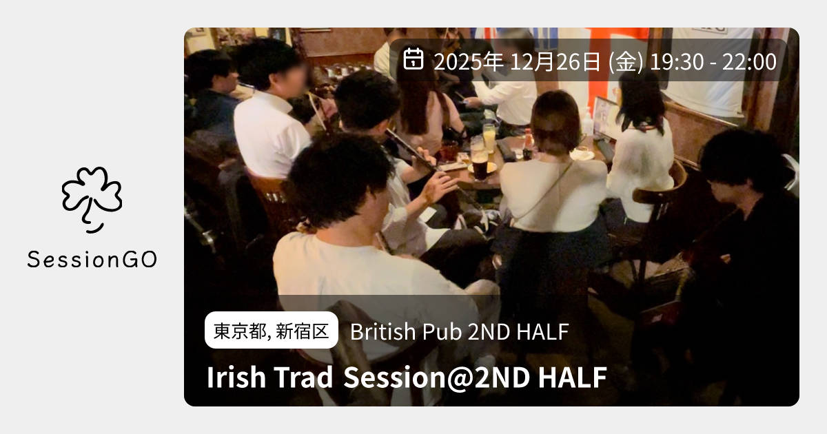 東京都, 新宿区British Pub 2ND HALFIrish Trad Session@2ND HALF2025年12月26日(金)10:30 - 13:00東京都新宿区高田馬場3丁目2主催者:まさと, かまわぬ🔰 初心者歓迎アイリッシュが中心のトラッドセッションです! 参加費は無料ですが、1人あたり2オーダー以上の注文をお願いします。酒もご飯も美味しいお店です。 店内にギターと電子ピアノもありますので、伴奏の方も気軽にご参加ください。 今回は申し込み不要ですので、フラッとお気軽にお越しください! ## ホスト まさと: コンサティーナ かまわぬ: フルート https://sites.google.com/view/2nd-half-sessionイベント内容をコピーして新規投稿※閉店・移転などにより、正常に表示されない場合があります