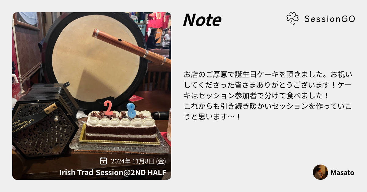 お店のご厚意で誕生日ケーキを頂きました。お祝いしてくださった皆さまありがとうございます!ケーキはセッション参加者で分けて食べました!